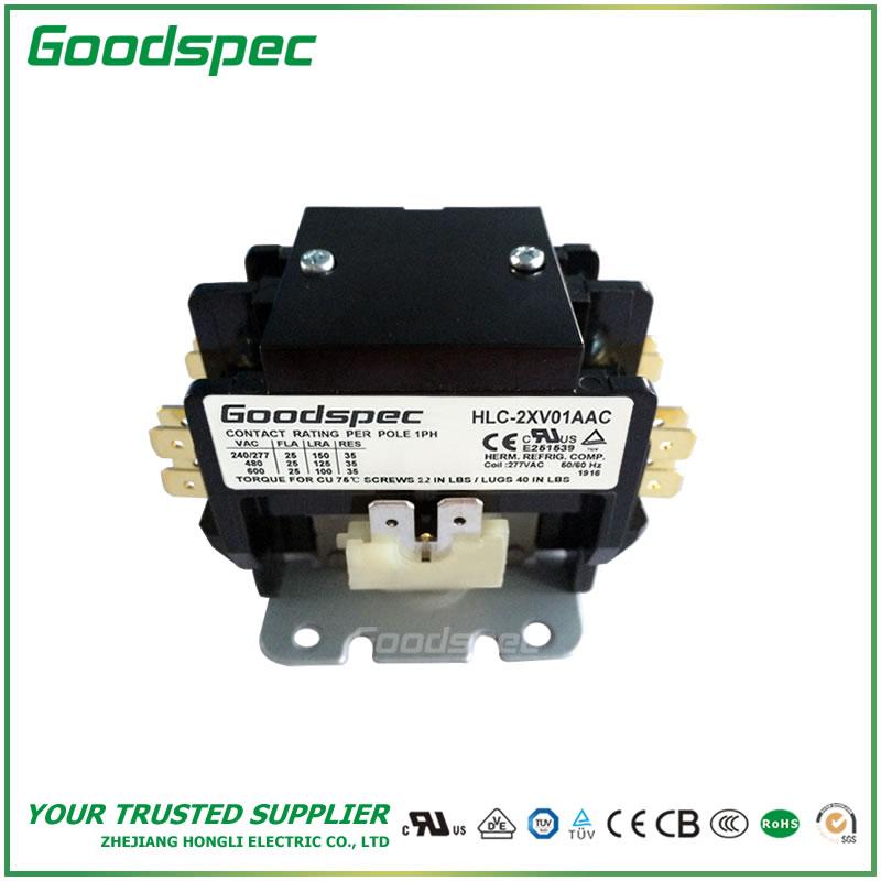 HLC-2XV01AAC(2P/25A/277VAC) Definite Purpose Contactor (Follow Defers To DP Contactor),Mainly Is Suitable For 50Hz Or 60Hz, When The AC-8a Use Category Fixed Working Voltage Is 240V Or 277V The Nominal Current Up To The 25A Electric Circuit, Is Suitable For The Starting And The Control Single-Phase Motor (Or Compressor) And Other Single-Phase Loads.Mainly Uses In The Domestic Electric Appliances Profession, Specially In Air Conditioning Profession,Conforms To IEC60947, UL508 and GB14048standard.